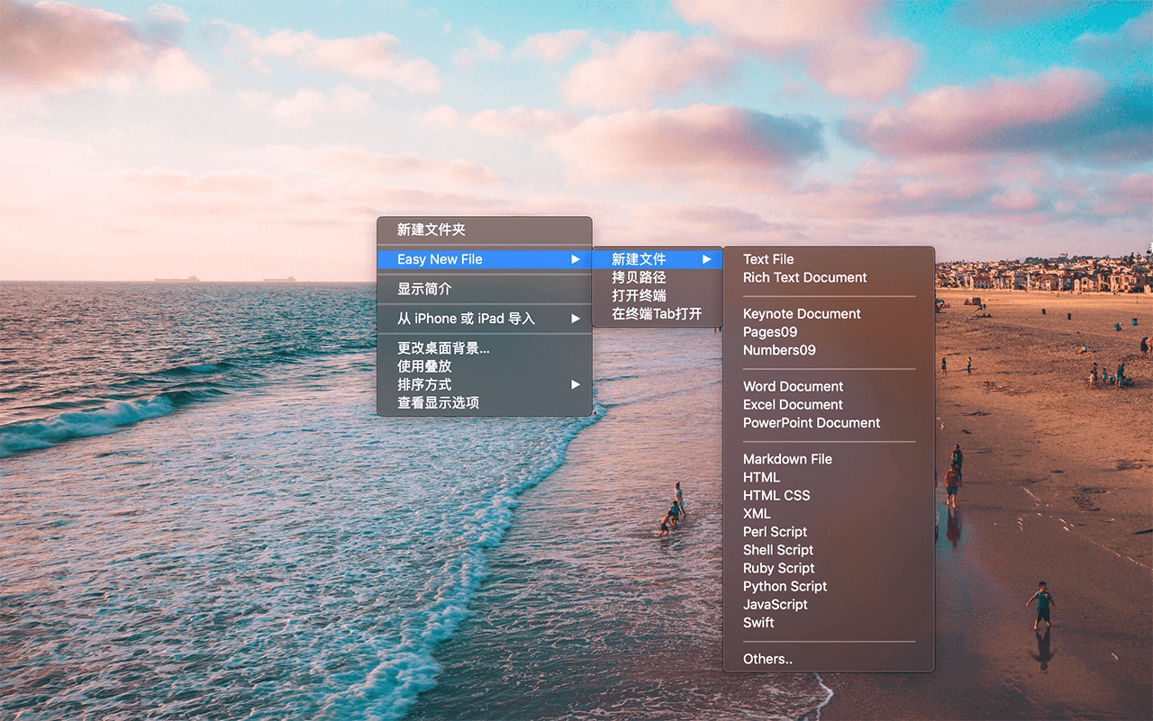 它是一款小巧的 Finder 扩展应用,可以为 Finder 右键菜单中添加「新建文件」、「拷贝路径」、「打开终端」等功能选项,其中「新建文件」一项可支持许多格式文件的创建操作,比如纯文本、富文本、Word/Excel/PPT、Markdown、HTML、XML 以及各类编程脚本,我也是最近才使用,觉得不错。