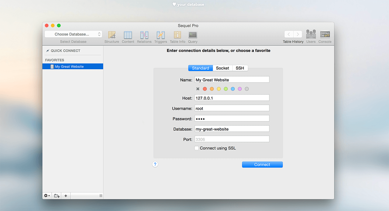 Mac上的MySQL管理工具,是我经常使用的工具,它支持包括索引在内的所有表管理功能,支持MySQL视图,可以同时使用多个窗口来操作多个数据库/表。