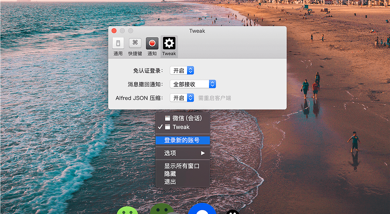 WeChatTweak 是一款微信客户端插件,仅支持 macOS,可实现阻止消息撤回、消息列表通知、系统通知、正常撤回自己发出的消息、客户端无限多开,具体的实现教程可自行google查看,地址:https://github.com/Sunnyyoung/WeChatTweak-macOS。