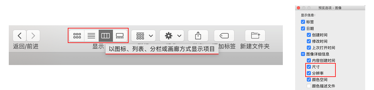如果想要显示图片分辨率及大小通常需要我们在 Finder 窗口对其显示预览选项进行设置。当然你也可以通过鼠标右键图片,选择显示简介来查看图片的尺寸、分辨率及大小的方法,但是这样更费时间。