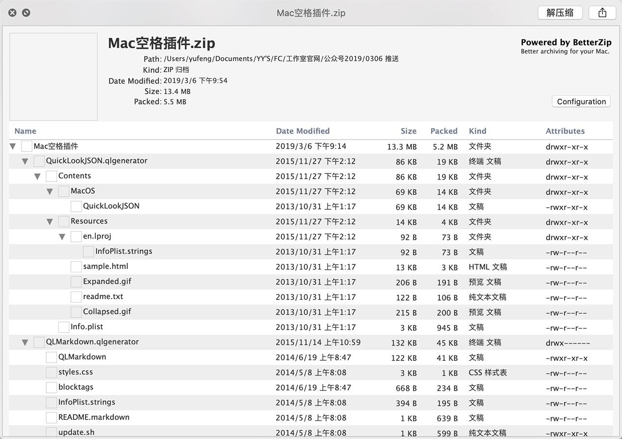 一般下载压缩包后需要先解压文件才能看到压缩包里的内容,BetterZipQL插件完美解决了这个限制,只需要按空格键就能快速预览压缩包内容。