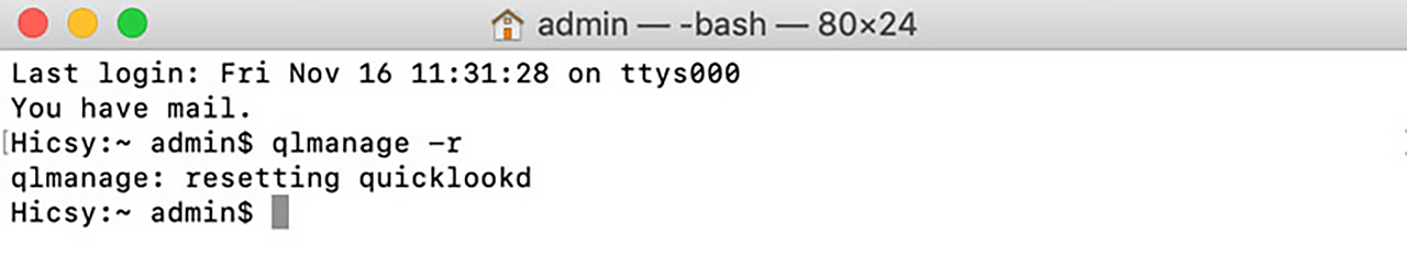 打开终端应用程序,输入 qlmanage -r 并回车,之后出现 resetting quicklookd 提示插件安装成功。