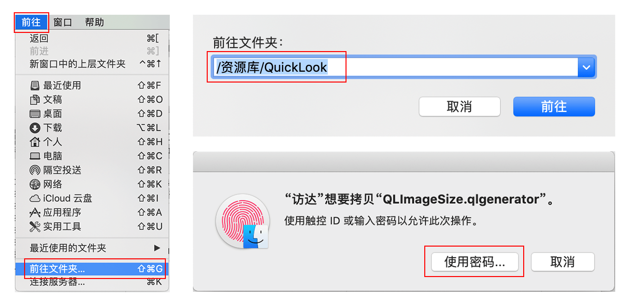 打开Finder,菜单栏 前往 / 前往文件夹(快捷键command+shift+G)前往文件夹输入 「 /资源库/QuickLook」回车进入QuickLook文件夹,将QLImageSize插件复制到QuickLook文件夹,复制前系统会提示使用触控ID或输入密码。