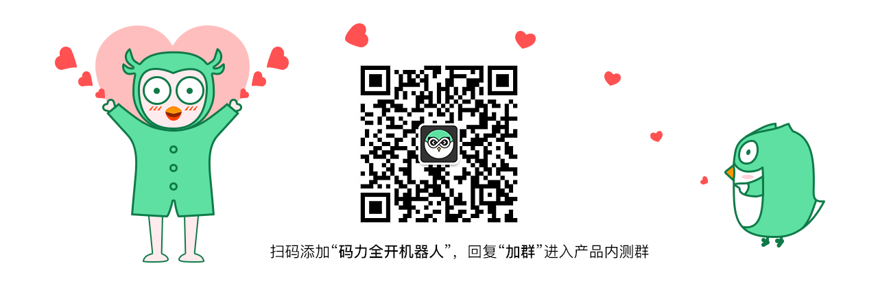 公众号后台回复『加群』识别二维码添加“码力全开机器人”,回复『加群』即可加入产品内测用户群。