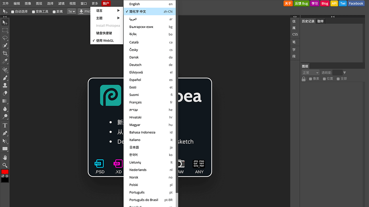 PhotoPea是由来自捷克共和国的IvanKuckir设计开发的,目前已经支持中文简体和繁体及其他38种语言,并且提供创建翻译的入口,支持用户共同完成更多语言的翻译。