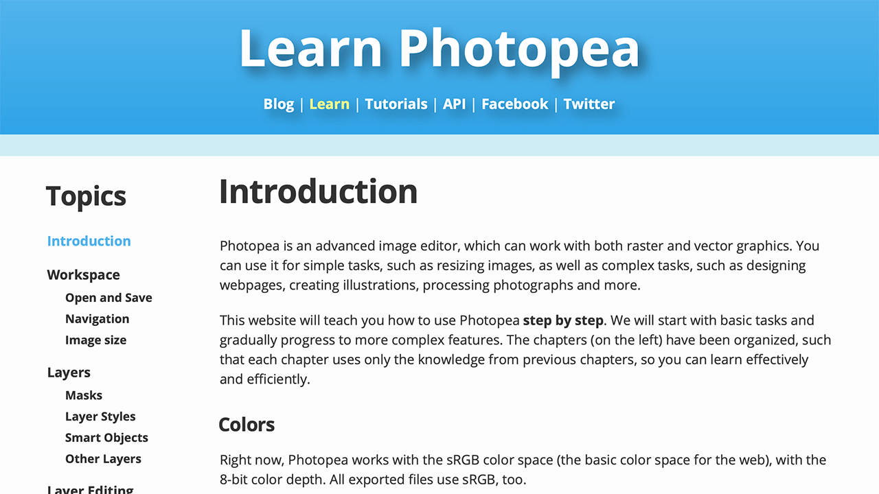 如果你不熟悉PhotoShop也不用担心,PhotoPea还提供了非常详细的功能介绍及使用教程帮你快速上手,通过PhotoPea你也可以入门PhotoShop是不是一举两得~