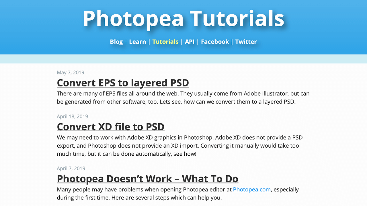 关于如何将Sketch转换为PSD、将PDF转换为分层PSD、将GIF添加到静止图像中、将XD文件转换为PSD、将EPS转换问分层PSD、打开RAW照片、修饰和增强脸部、替换面孔…PhotoPea都有提供相关教程。