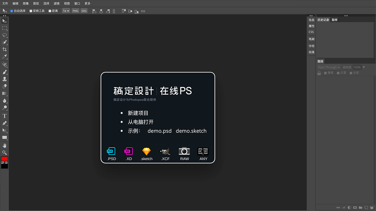 在国内还有一个问题就是打开外网速度不稳定,想使用PhotoPea可以试试「搞定设计 | 在线PS」它是搞定设计与PhotoPea联合提供的,速度相对稳定反应会稍快一些。