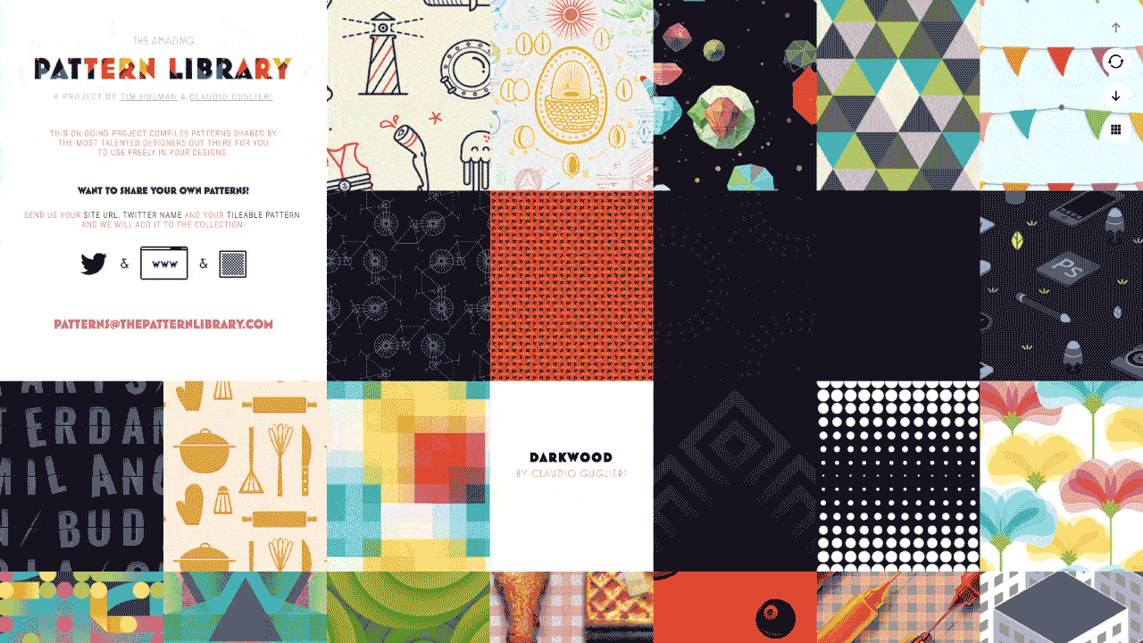The Pattern Library是由美国开发者TIM HOLMAN和前微软创意总监CLAUDIO GUGLIERI联手打造的一个免费分享背景素材的网站,打开网站,首页随机全屏显示一个背景素材,上下滑动页面或点击随机按钮即可切换预览网站提供的背景素材,点击左上下载按钮获取背景素材文件。
