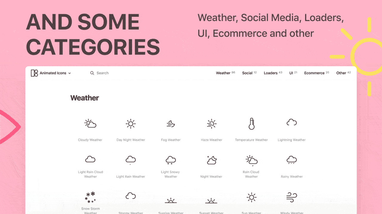 这些特征鲜明的动画图标,以多种格式免费获取它们,超过200个动画图标包,包含社交媒体、加载动画、电子商务、运动中的天气、视频和音乐的媒体图标等等。