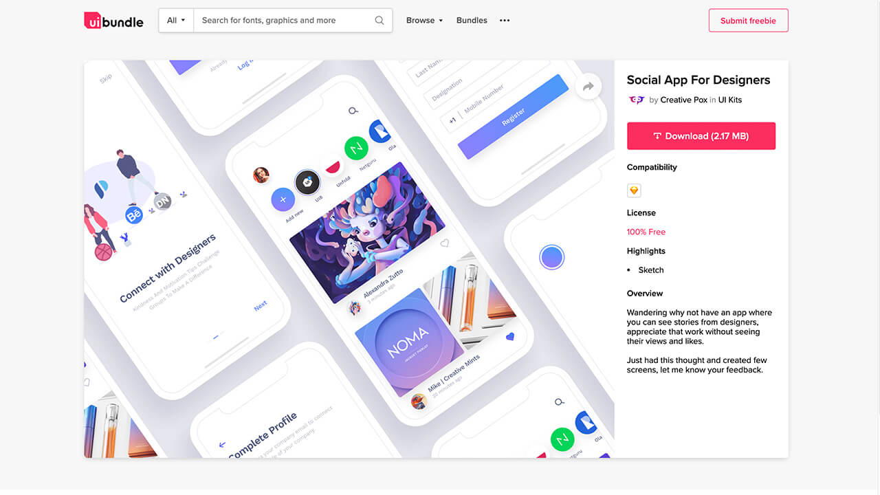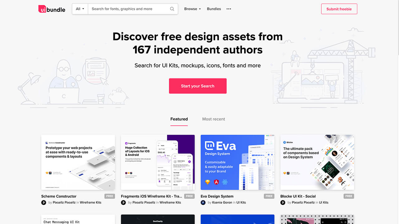 打开网站,可以看到大标题写着发现来自167位独立作者的免费设计资产,在这里你可以搜索UI套件、模型、图标、字体等资源。