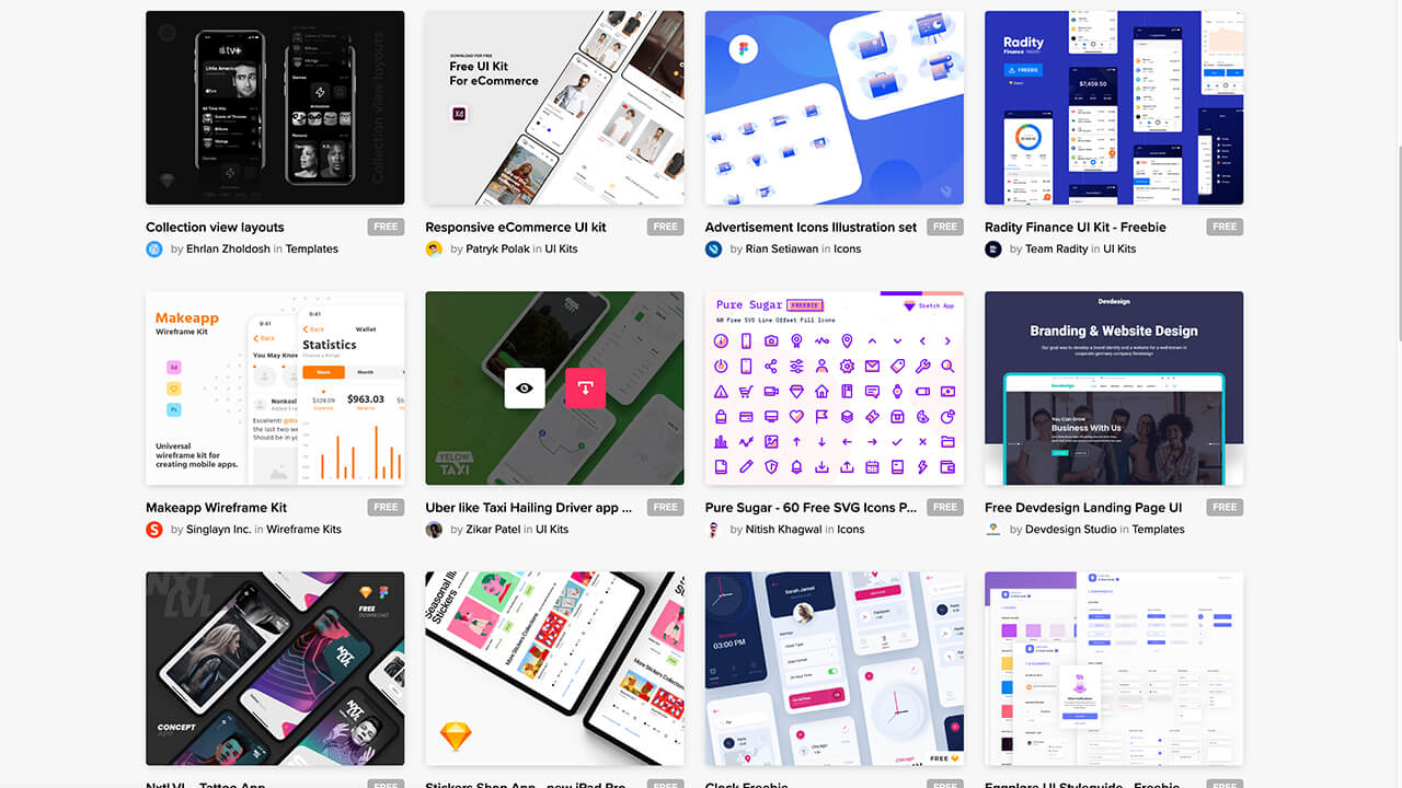 往下继续翻可以看到很多UI套件、图标、字体等资源,资源有Sketch、XD、PSD、AI等格式,鼠标移动到图片上即可预览或直接下载。