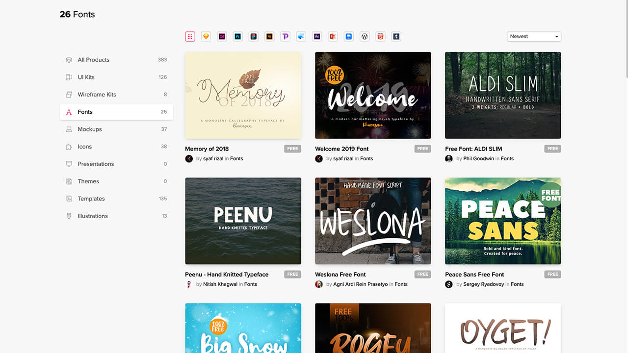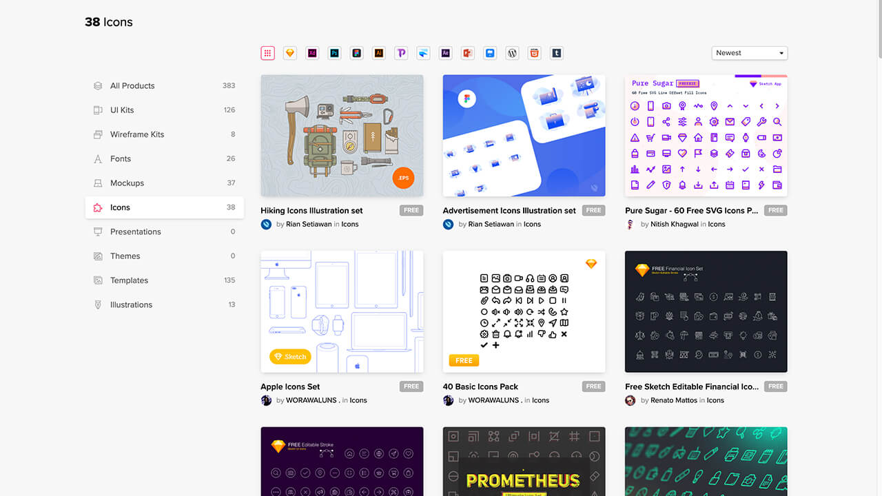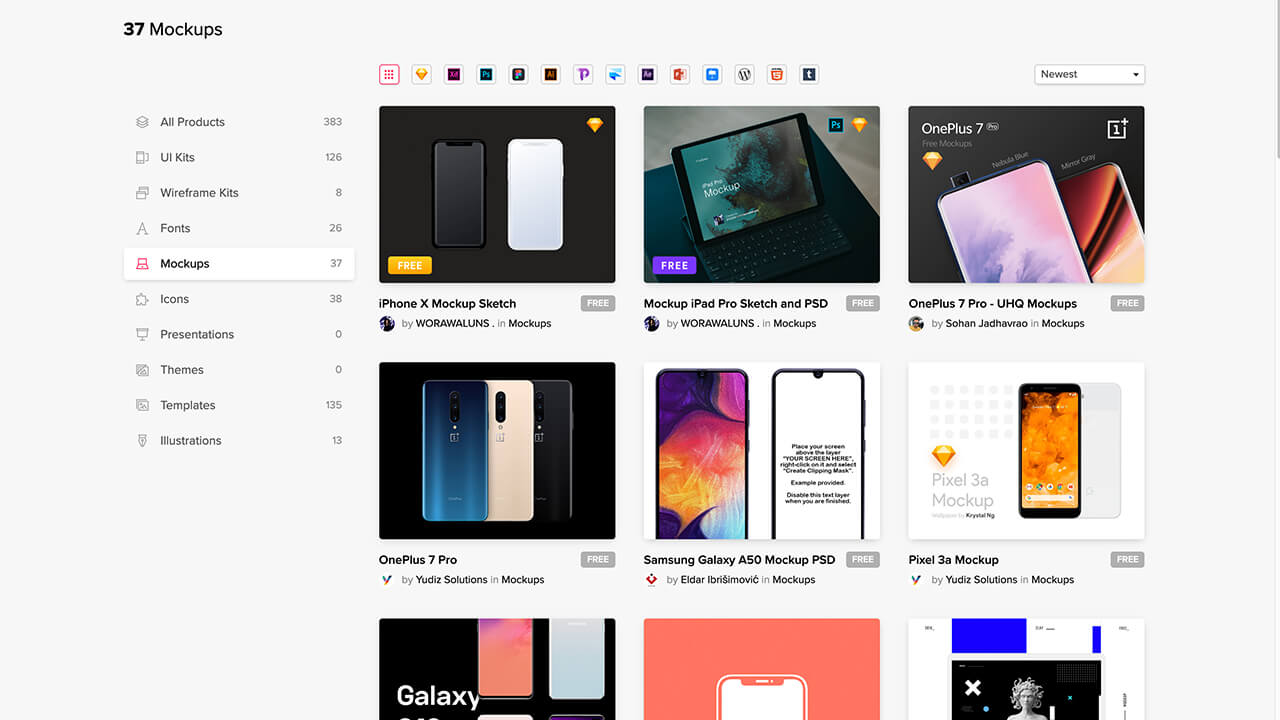 网站顶部搜索入口旁边点击Browse即可选择对应的分类,有UI套件、线框套件、字体、样机、图标、插画等资源。