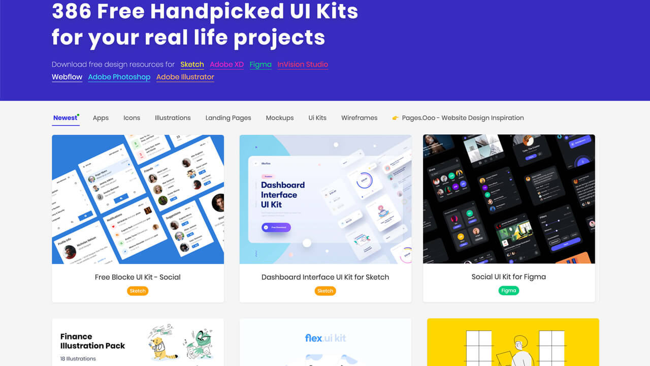 打开网站,就可以看到大标题为你的项目提供386个免费精选UI Kits,这里提供了8个分类,分别是应用、图标、插画、网页、样机、UI套件、线框、网站设计灵感。