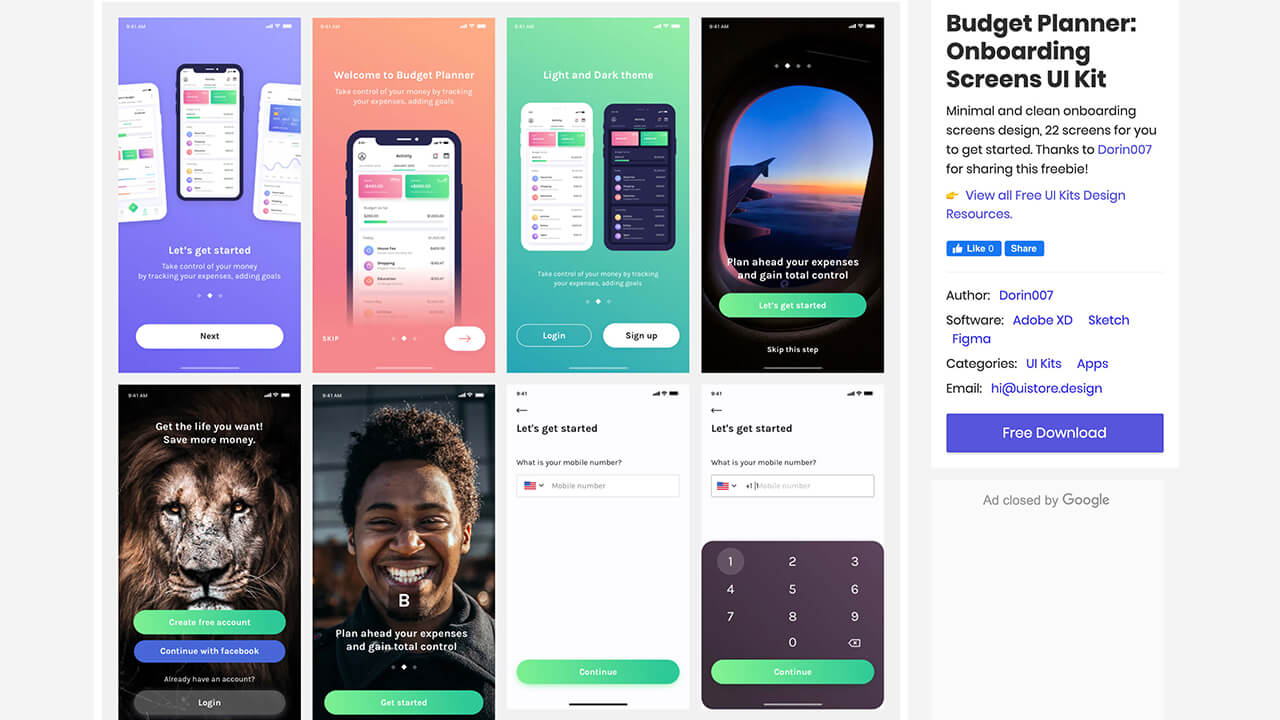 比如选择一个UI套件进入到详情页就可以看到免费下载的按钮以、作者的信息、文件支持的格式等等。