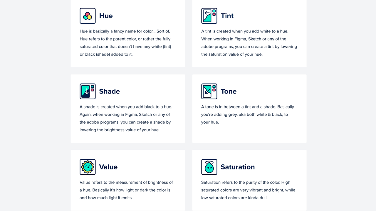 往下翻可以看到让我们学习颜色的术语,比如色调、色度、饱和度等等,每个都有对应的解释。