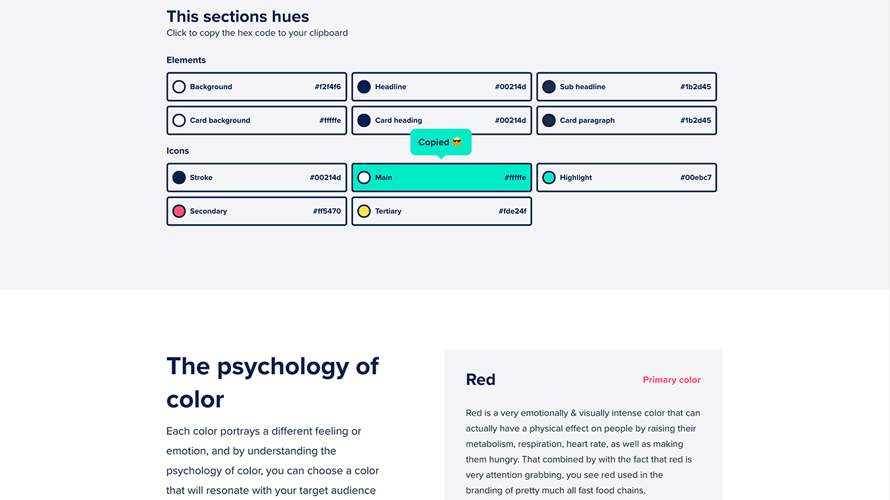 下面是色彩心理学部分,每种颜色都表现出不同的感觉或情感,通过了解颜色的心理,您可以选择一种能够与目标受众产生共鸣并散发出想要的氛围和情感的颜色,这里同样提供了对应的色调,点击即可复制色值。