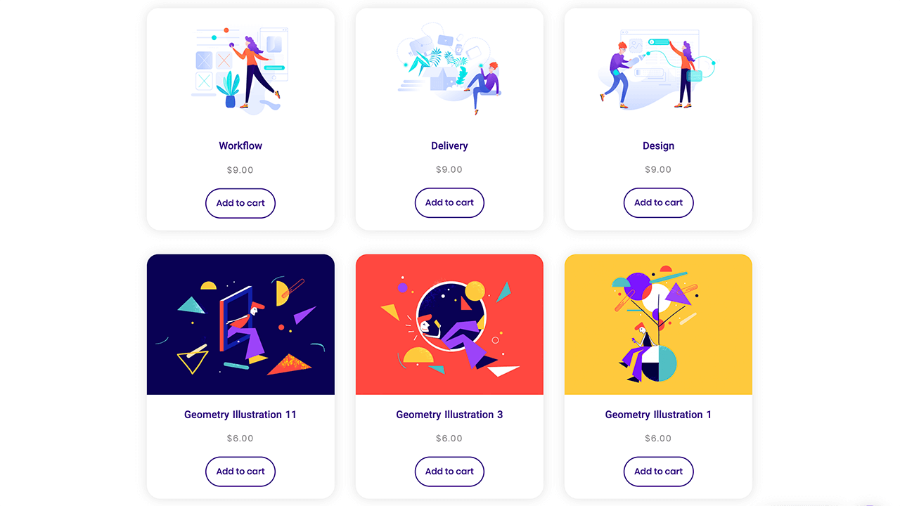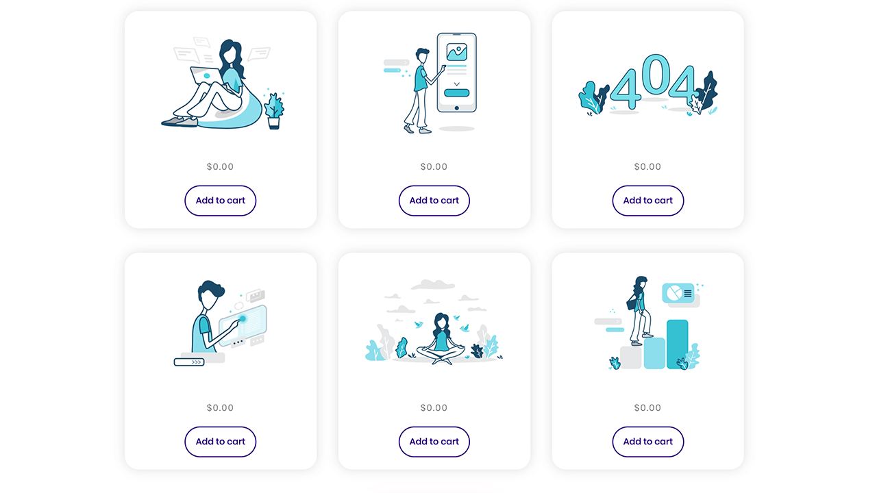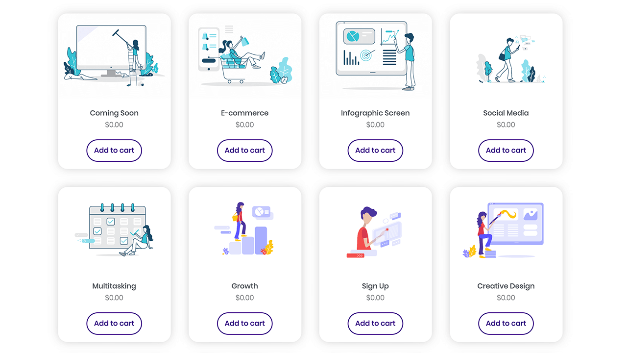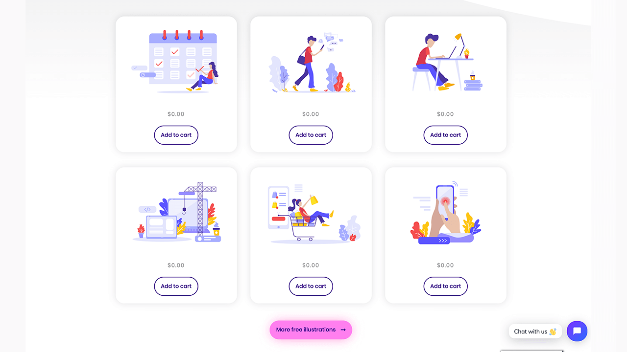 上面可以看到不同类型的彩色插画,定价是0元,点击Add to cart即可加入到购物车免费下载,也可以点击More Free illustrations查看更多插画内容。