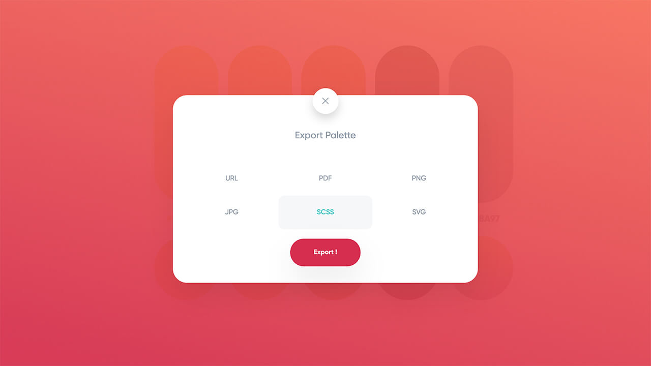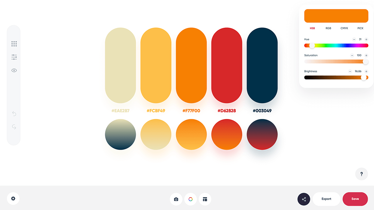 colors.dopely支持很多功能,比如:从图像中选取起始颜色并自动获得完美的组合 / 通过调节温度、色相、饱和度、亮度等来精确自定义颜色 / 支持导出PNG、PDF、SCSS、SVG等格式