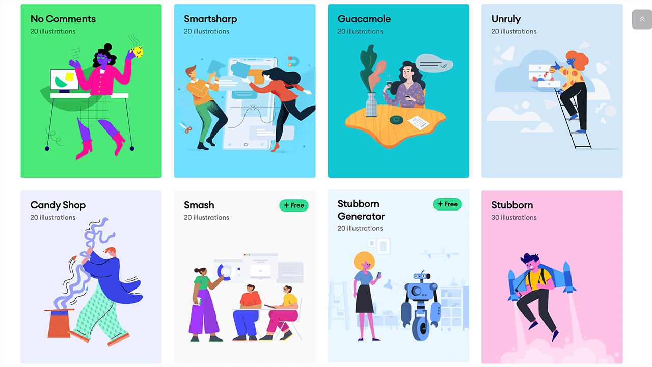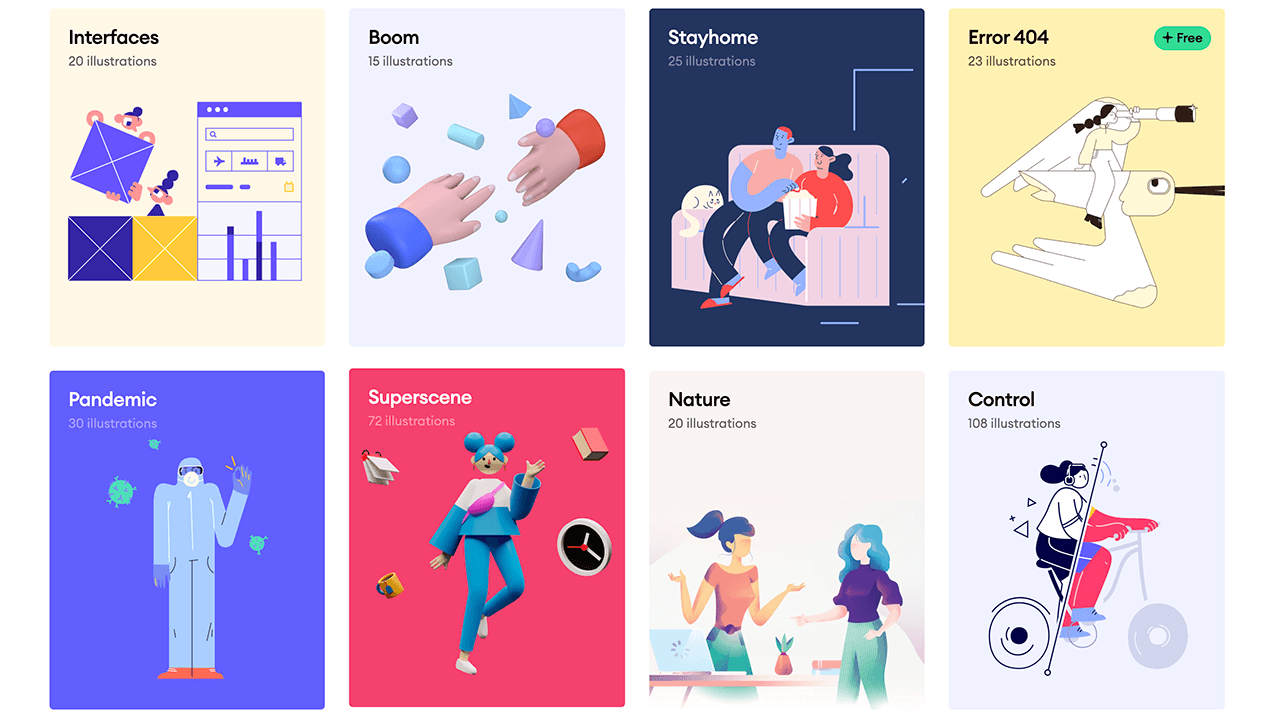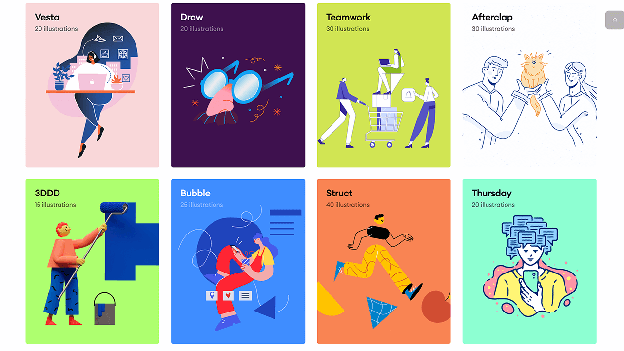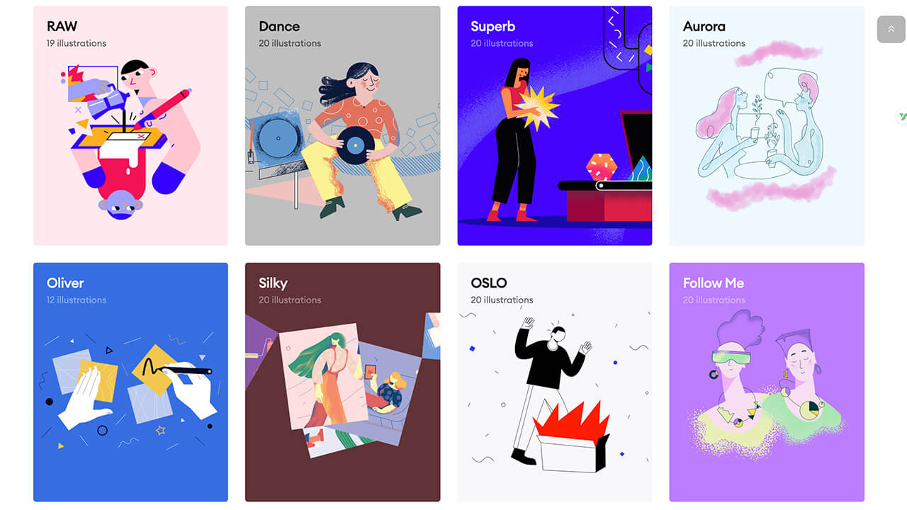 网站往下翻可以看到43个免费和付费的插画主题,风格多样,可以直观看到该插画主题提供的插画数量。