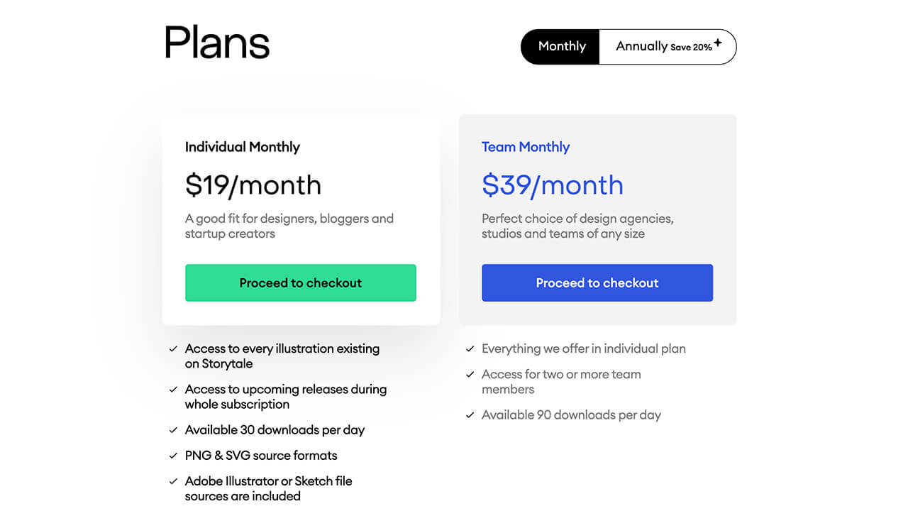 如果想解锁所有的插画内容,网站提供了个人和团队付费方案,不同的权限可以解锁对应的功能。