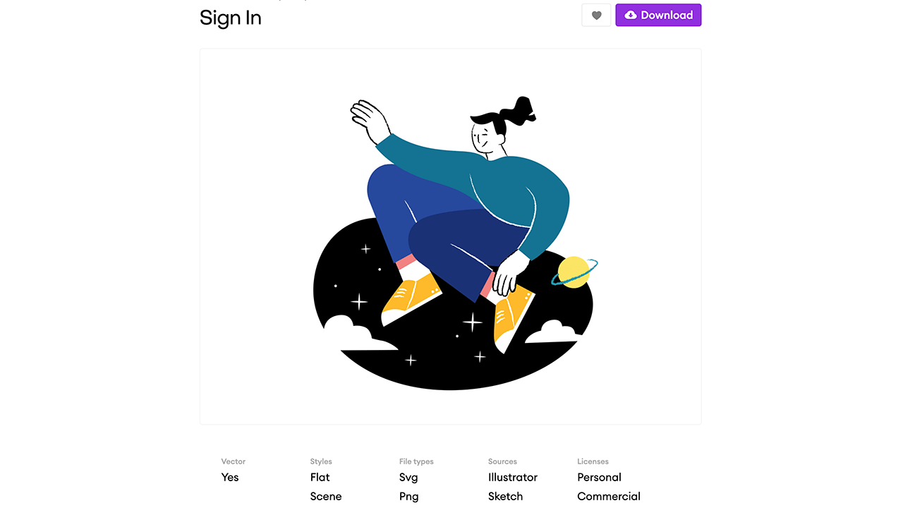 点击其中的一个插画素材,插画素材详情页提供下载入口以及插画的格式、样式、来源、是否商用能信息。