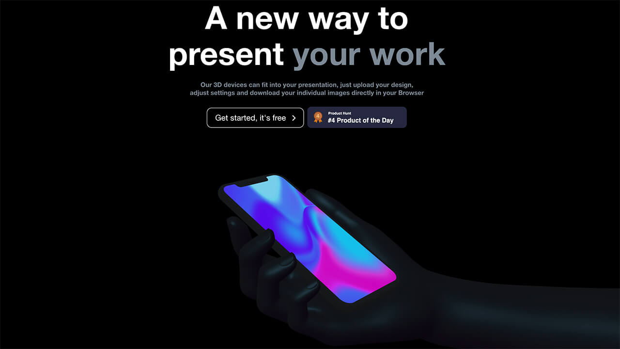 打开网站,可以看到标题就是这些生成的3D设备非常适用于你的产品和演示文稿,它曾是ProductHunt当天排名第四的产品。
