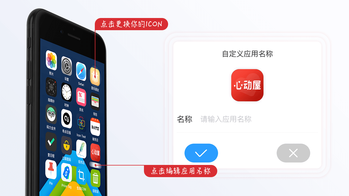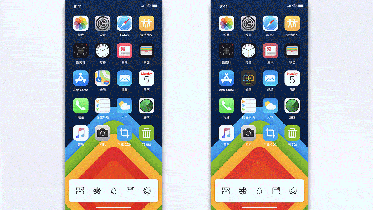 Icon Test首页类似iOS原生系统的宫格布局,你只需要把做好的Icon 发到手机上,打开App随意点击任何一个图标即可替换,同时点击名字也可以修改。