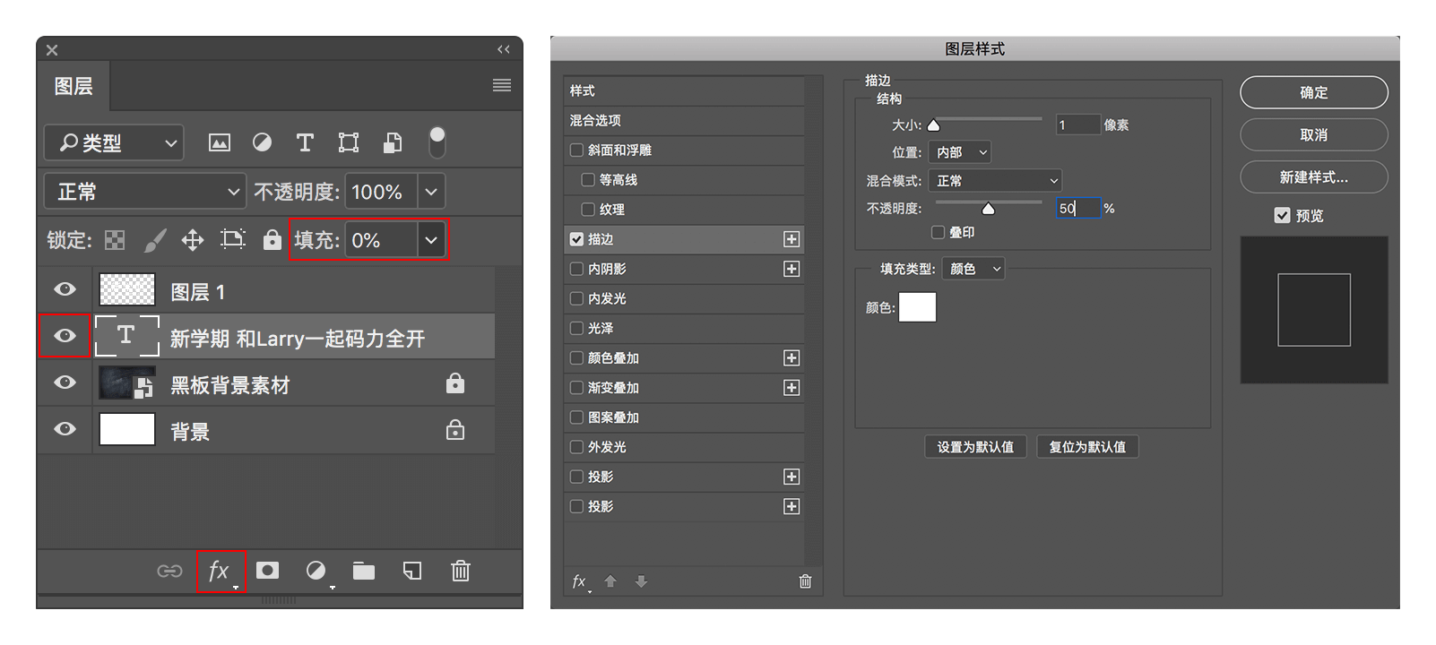 9、command+D 取消图层1选区,图层面板点击文字图层前的小眼睛显示文字图层,设置图层填充为0%,点击图层面板底部的添加图层样式图标,给图层添加大小1px、白色#ffffff、不透明度50%的内部描边;