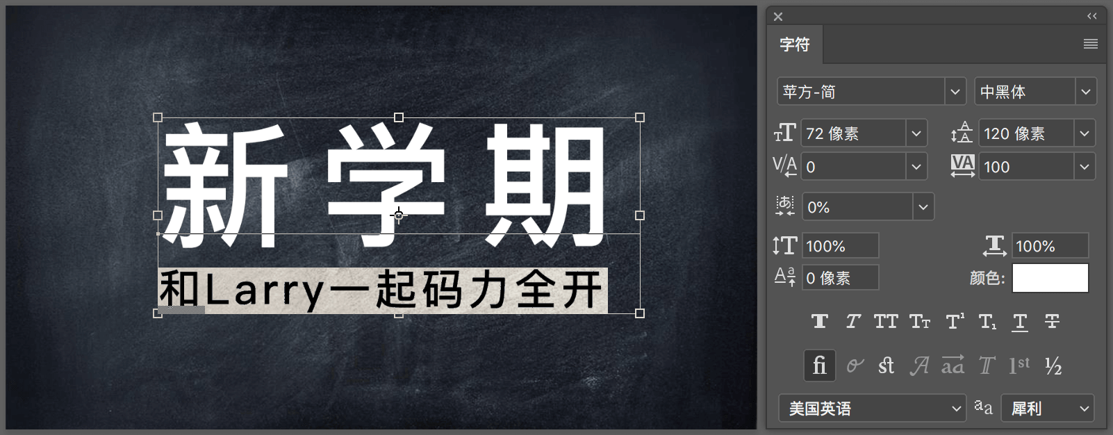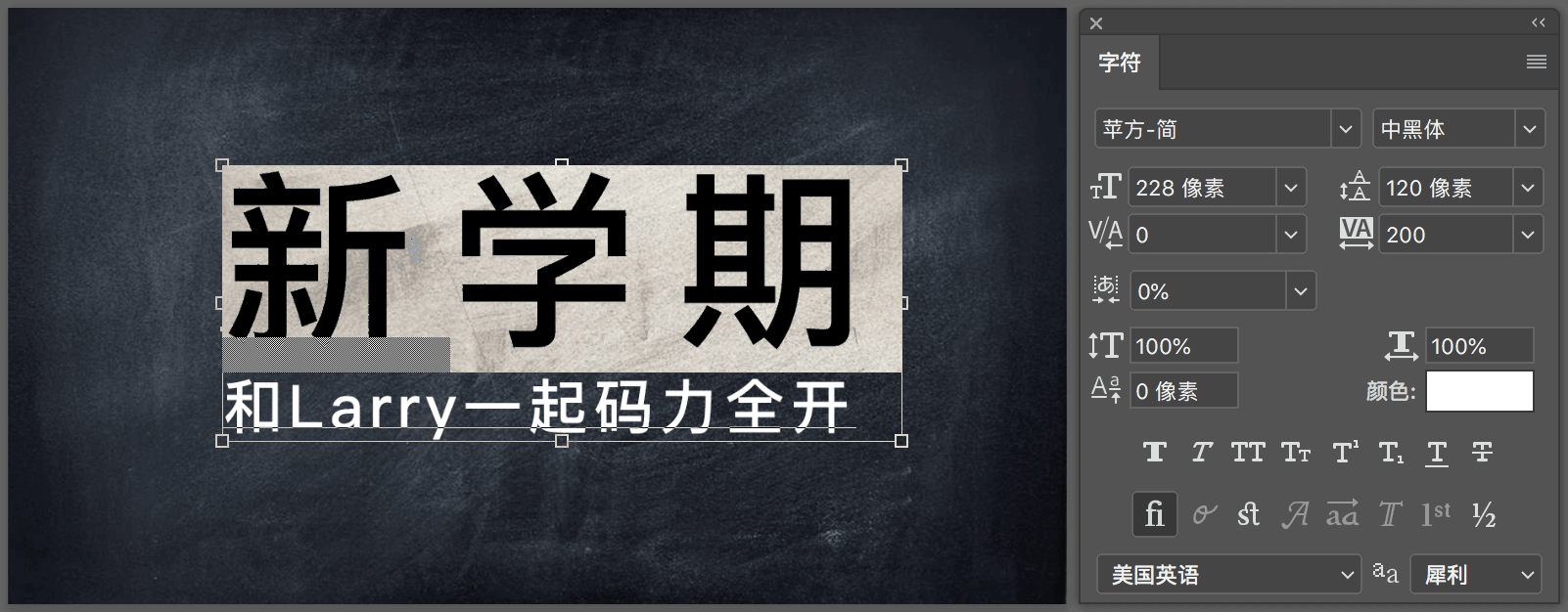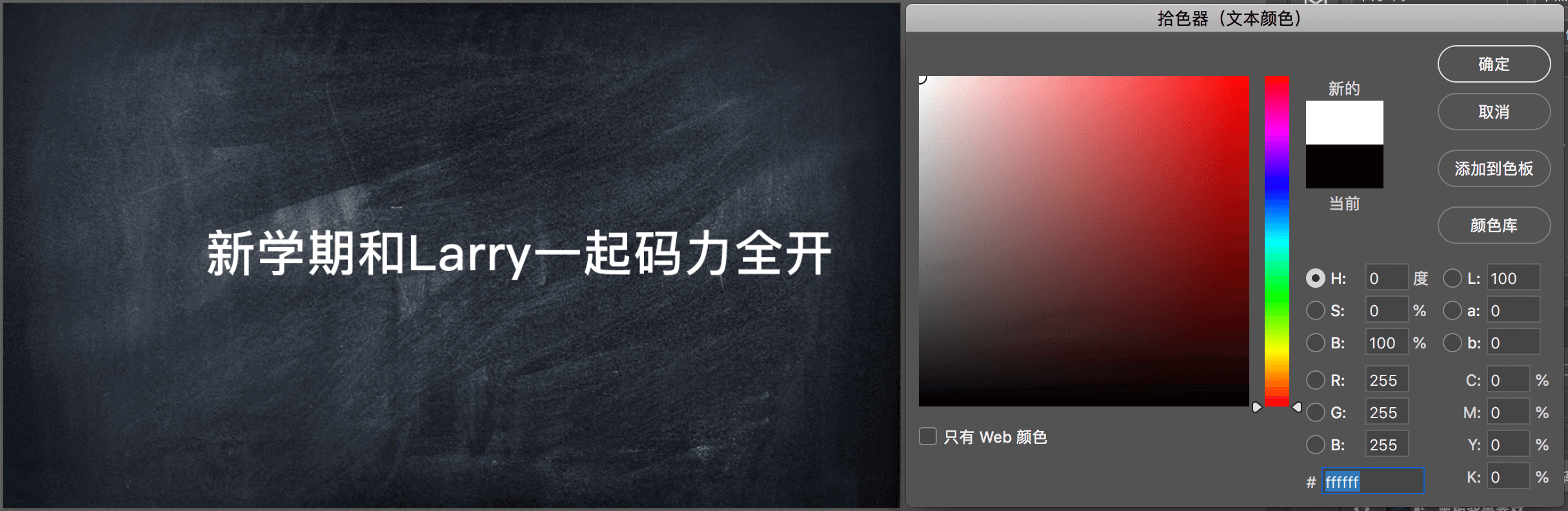 3、横排文字工具T在画布点击输入文字“新学期和Larry一起码力全开”,字符窗口点击颜色,在弹出的拾色器里更改字体颜色为白色#ffffff;