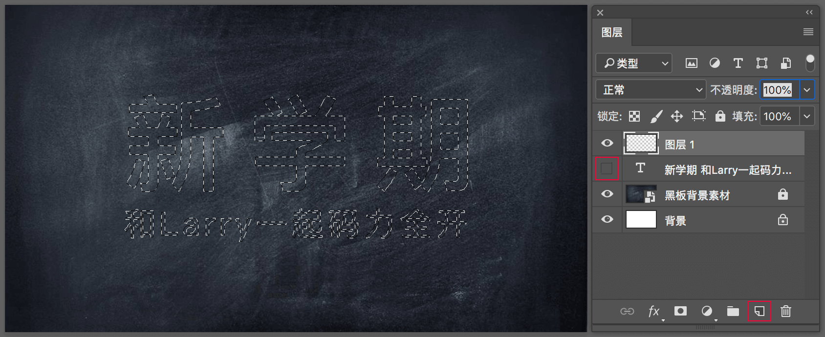 6、图层面板点击文字图层前的小眼睛将其隐藏,点击图层面板底部的创建新图层图标,或快捷键option+shift+command+N创建新图层;