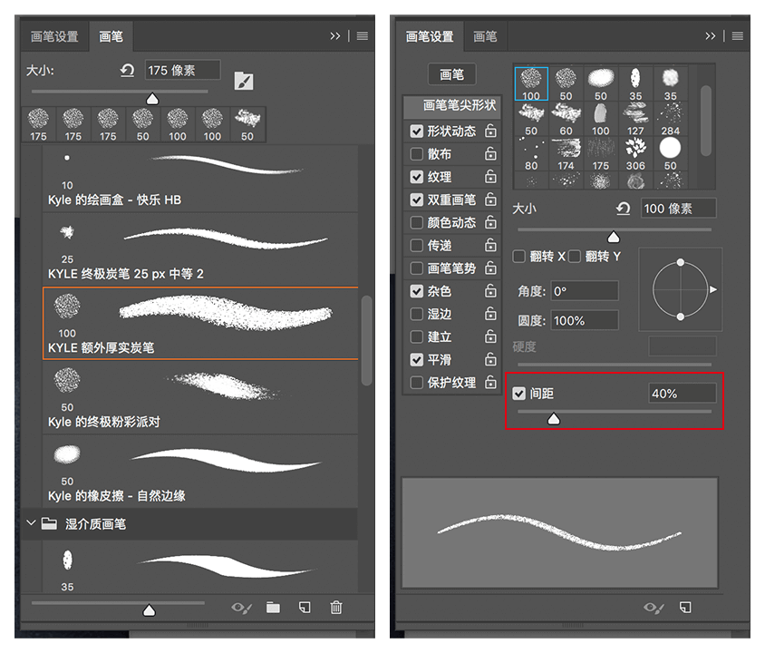 7、选择画笔工具B,打开画笔设置窗口F5,在画笔窗口选择PS自带画笔KYLE 额外厚实炭笔100(其他带有不规则边缘效果的画笔也可以),画笔设置窗口设置画笔间距40%;