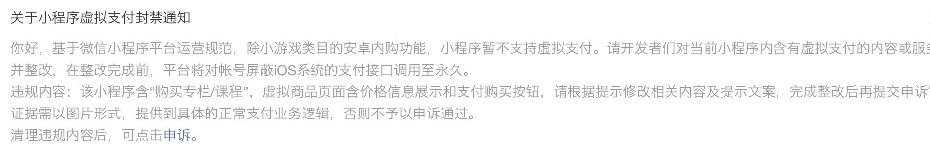 微信新出政策,不允许虚拟商品上架且有虚拟支付功能,导致码力全开小程序封禁,期间通过微信开放社区和官方人员不断沟通,最终封禁解除,重新上线了。