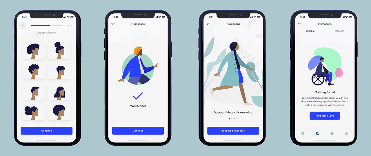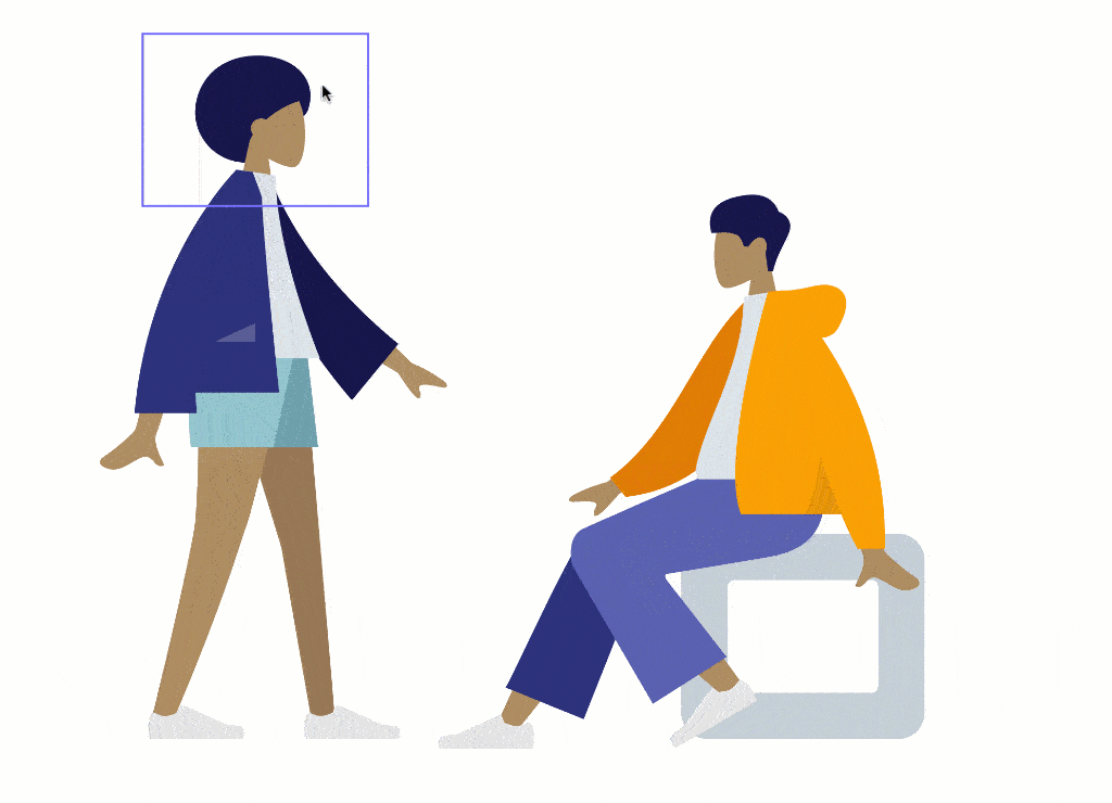 humaaans 素材包含人物和场景元素,不仅有整体的插画素材文件,还有单独的部件素材文件——男女头像、身体、腿、物件、场景,你可以在对部件进行随意替换,自由搭配组合形象效果。