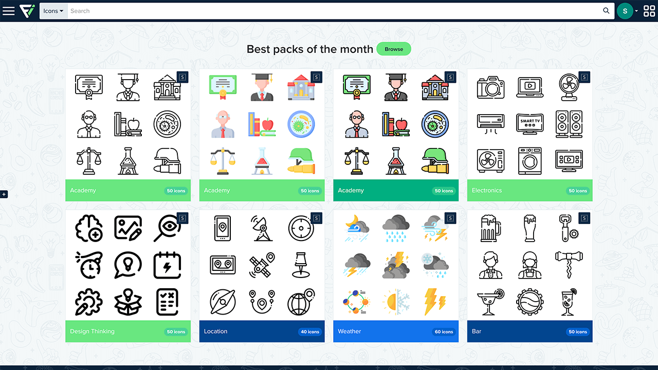进入浏览每月最佳图标合集推荐页面,你可以从网站拥有的35900+图标合集中优先浏览这些优秀的图标合集,同时网站提供注册登录后每天免费下载一定数量的图标及合集,不过你也可以付费升级你的账号从而获得更多的权限及独家内容。