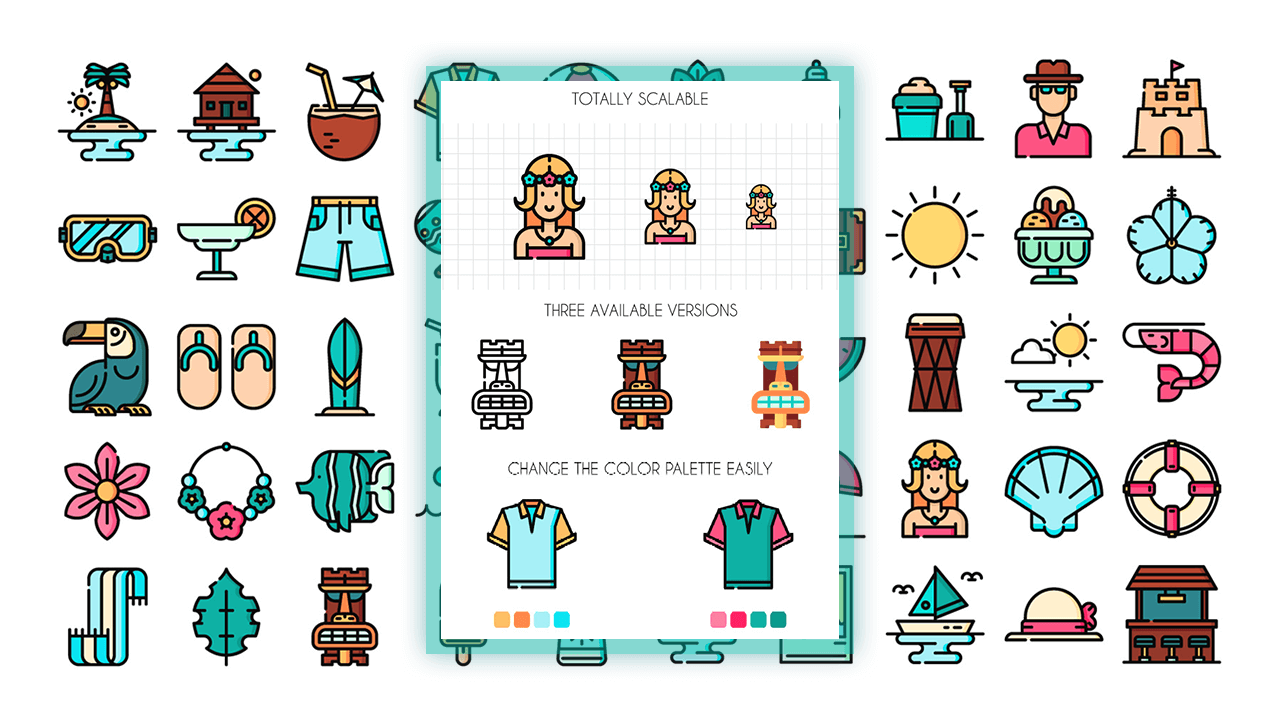 热带图标集包括棕榈树、沙滩球、鸡尾酒、冲浪板、波浪、冰淇淋、比基尼、防晒霜等在一切热带度假中能看到的信息,图标设计精美、色彩鲜艳,每个图标都提供 .png 和 .svg 两种格式,线性、面型、线面结合型三种风格版本,你可以完美地用于任何与旅行相关的项目,或者添加一些欢快和夏日的东西。