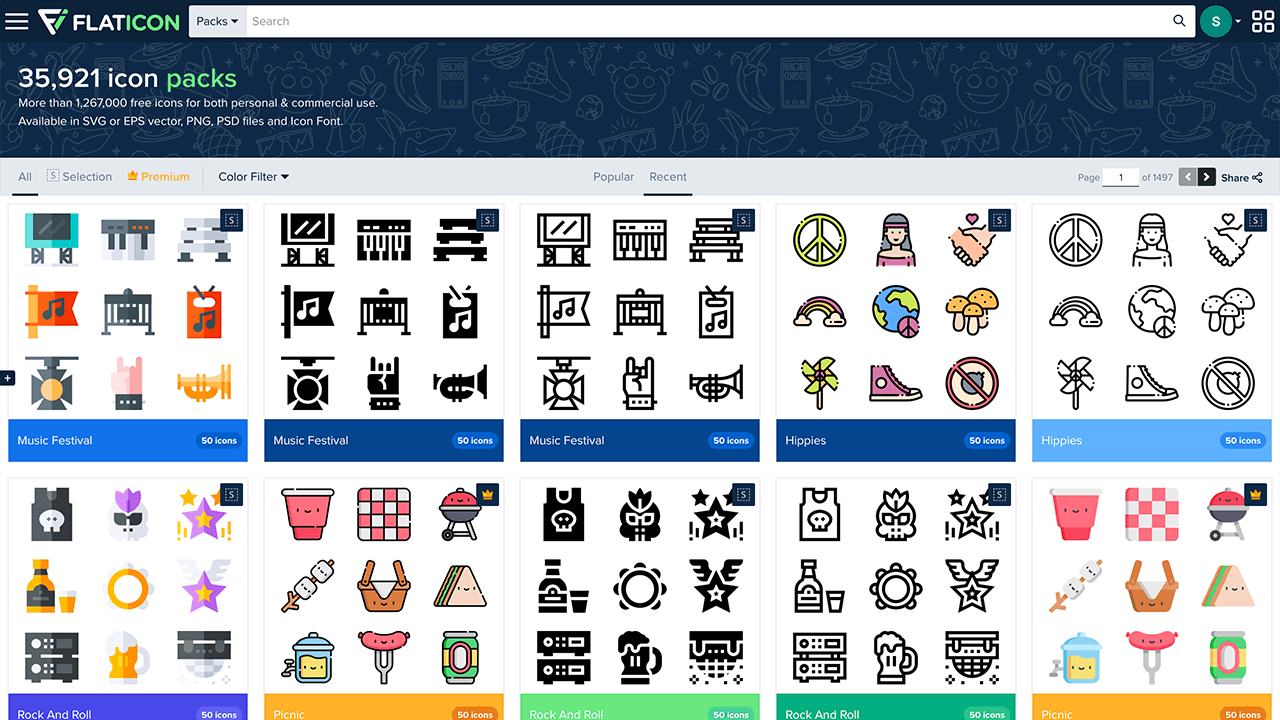 Flaticon是由设计师和开发人员创建的 Freepik公司的三个独立项目之一——最大的图标数据库,目前拥有超过1734000个图标、35900+图标合集。与其他图标素材网最大的不同就是这个网站将图标合集作为主推对象,这也是我今天把它推荐给大家的主要原因,在网站首页你最先看到的就是每个月的最佳图标设计合集推荐。