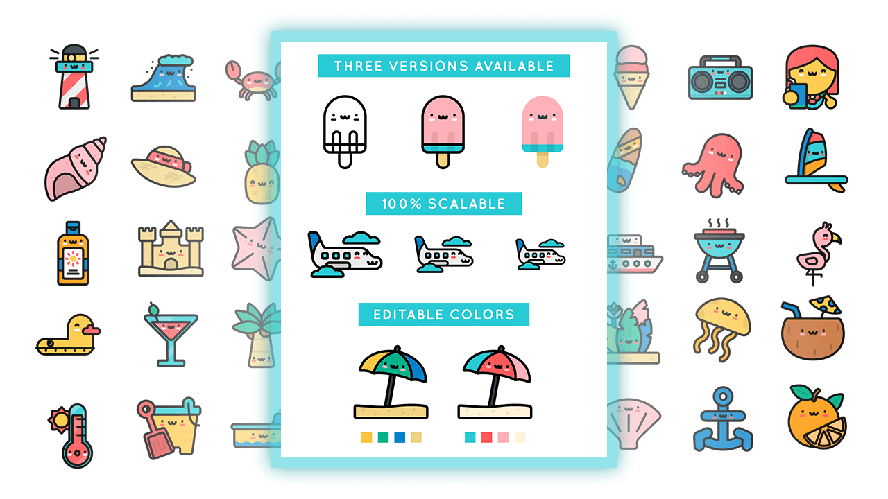 夏天是越来越近了,这组图标合集包含了一系列有趣和丰富多彩的图标,可以满足你夏季的所有需求,每个图标都提供 .png 和 .svg 两种格式,线性、面型、线面结合型三种风格版本,好好运用就能快速解放你的夏日时光~