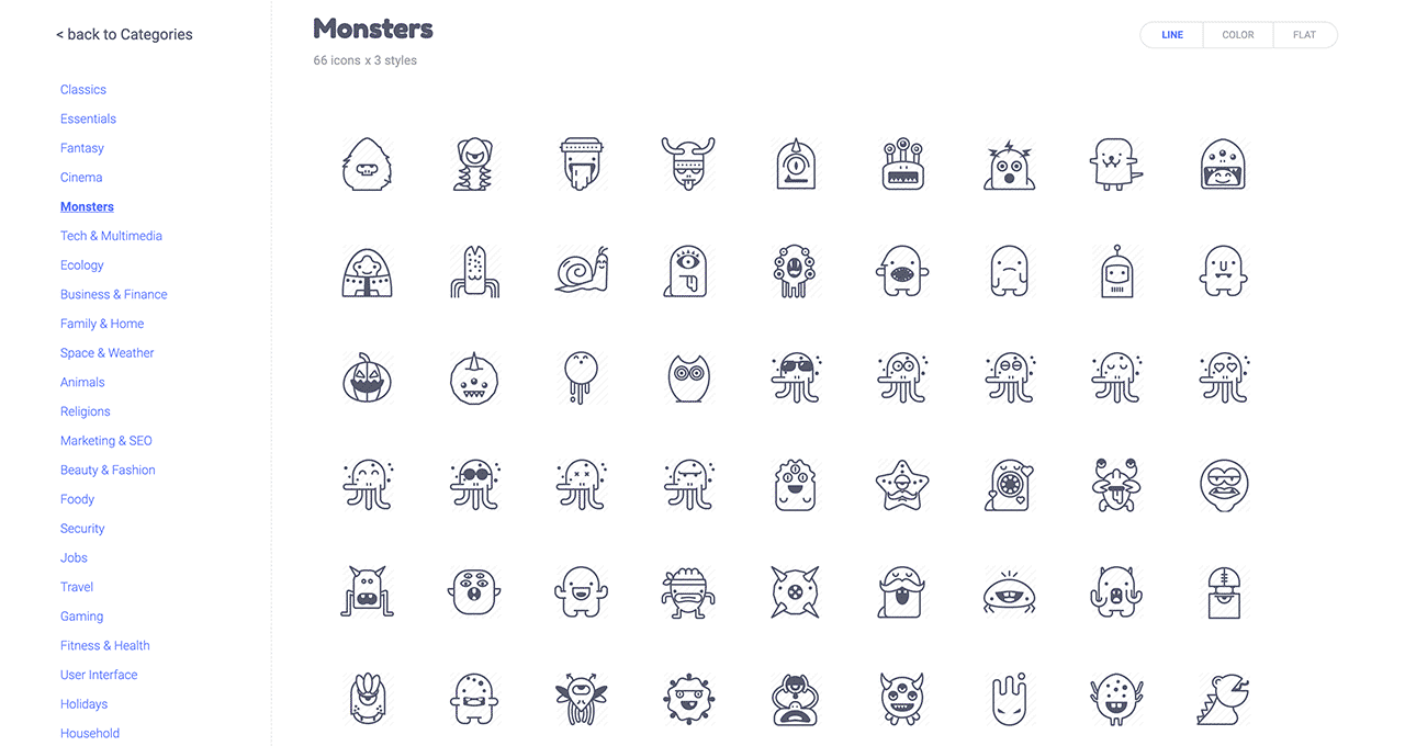 随便选一个类别进入浏览图标,在类别名称下面会显示该类别所包含的图标数量,同时提供LINE/COLOR/FLAT三种图标风格切换按钮,供你快速切换风格查看图标。