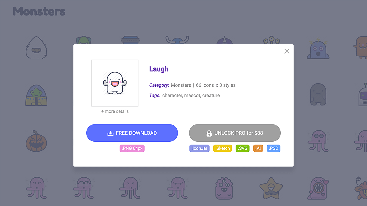 将鼠标移入你喜欢的图标点击,弹出图标下载弹窗,网站所有图标均支持PNG格式、64x64px尺寸免费下载,此外88美元付费解锁PRO版本,获取IconJar、Sketch、SVG、AI、PSD、PNG128px、PNG256px下载格式。