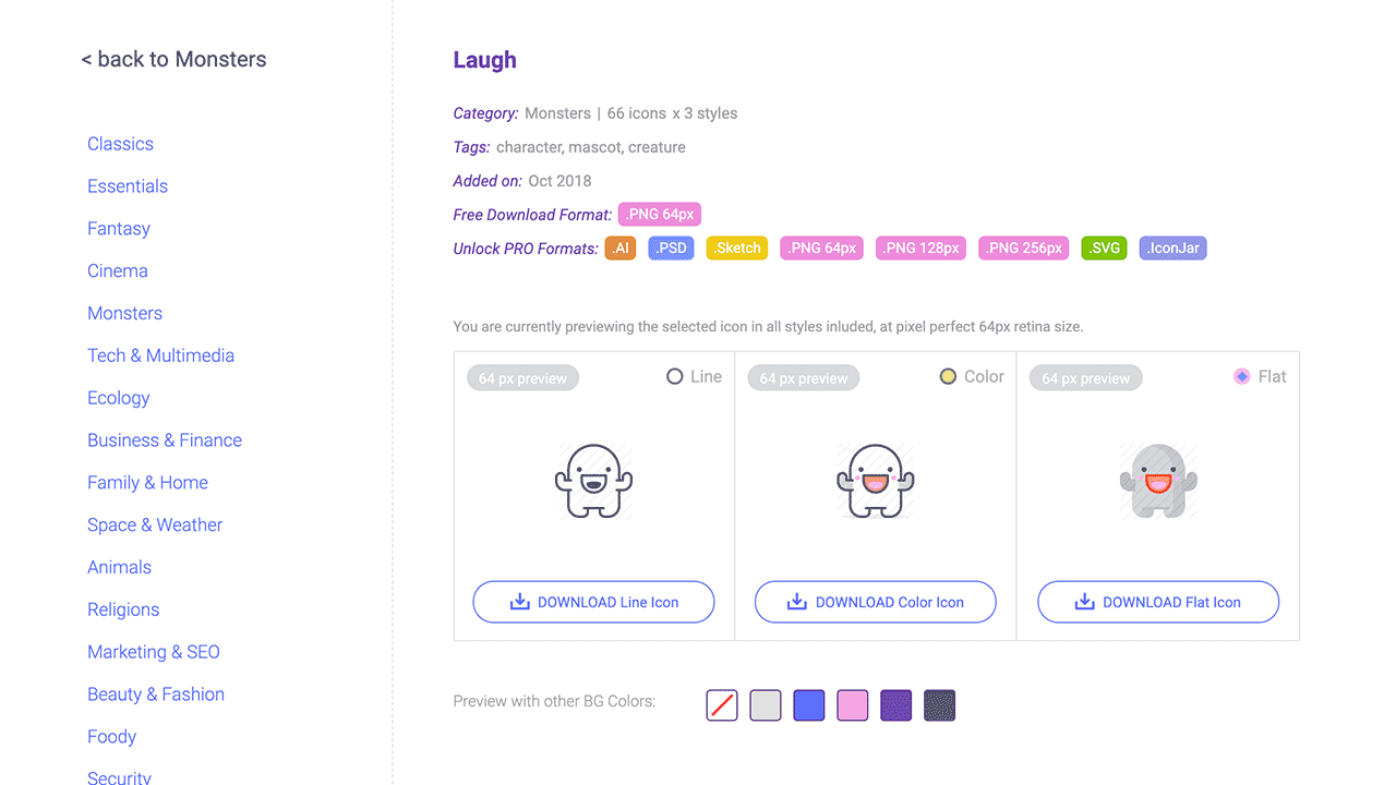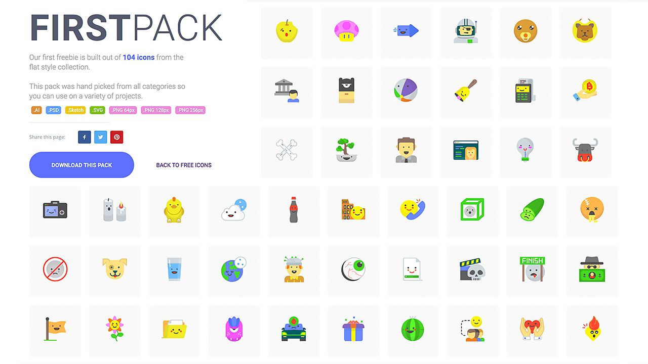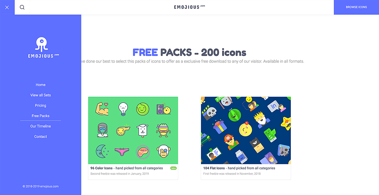 除了分类别查看所有类别的图标外,Emojious还从所有类别中挑选了2个免费图标包——96 Color Icons、104 Flat Icons,共计200个图标。这些图标可以免费下载网站所支持的任何格式。