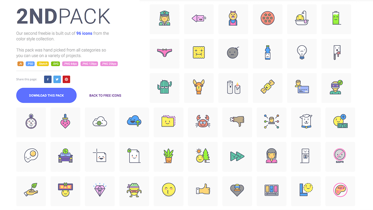 96 Color Icons是Emojious近期支持免费的图标合集,其中有96个彩色线性图标,所有图标是从网站所有类别中挑选出来的,因此你可以在各种项目中使用。点击「DOWNLOAD THIS PACK」一键下载所有图标。