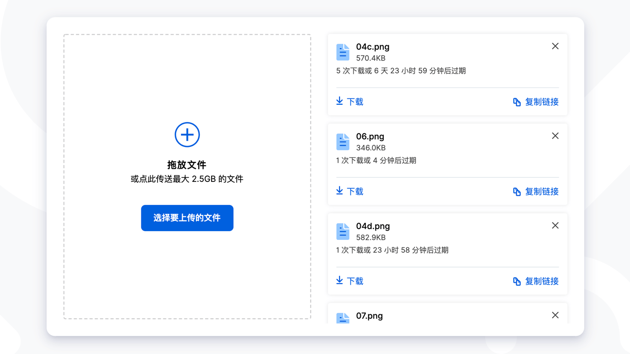 你上传的所有文档在失效前都会显示在上传文件框的右侧,你可以对这些文件进行下载、复制链接及删除操作。