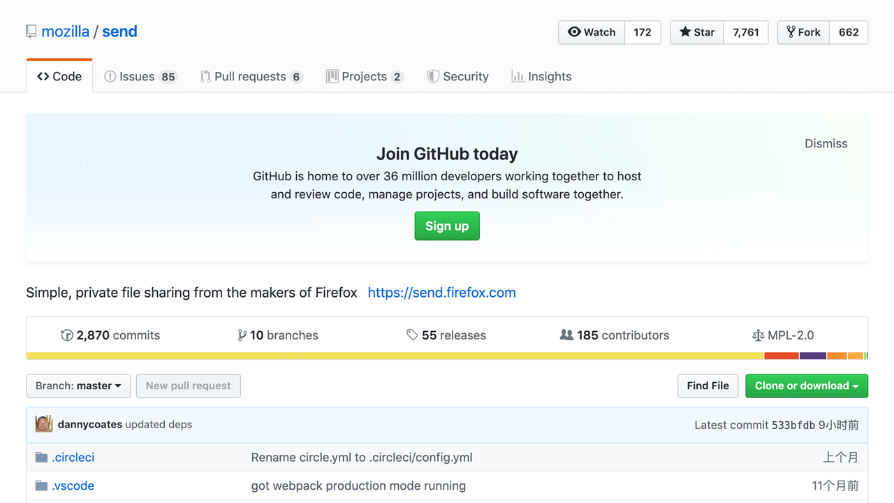 Firefox Send目前已开源到GitHub,拥有7761个Star,感兴趣的话可以自己去看一看。