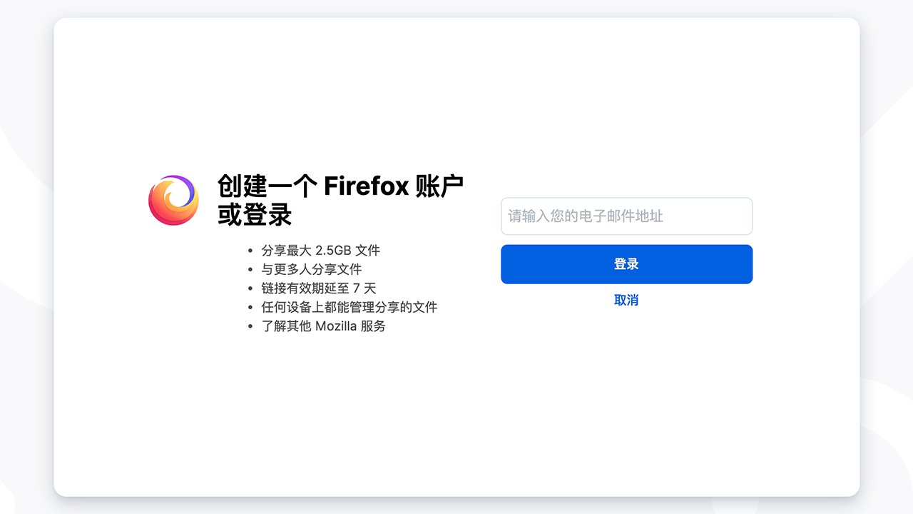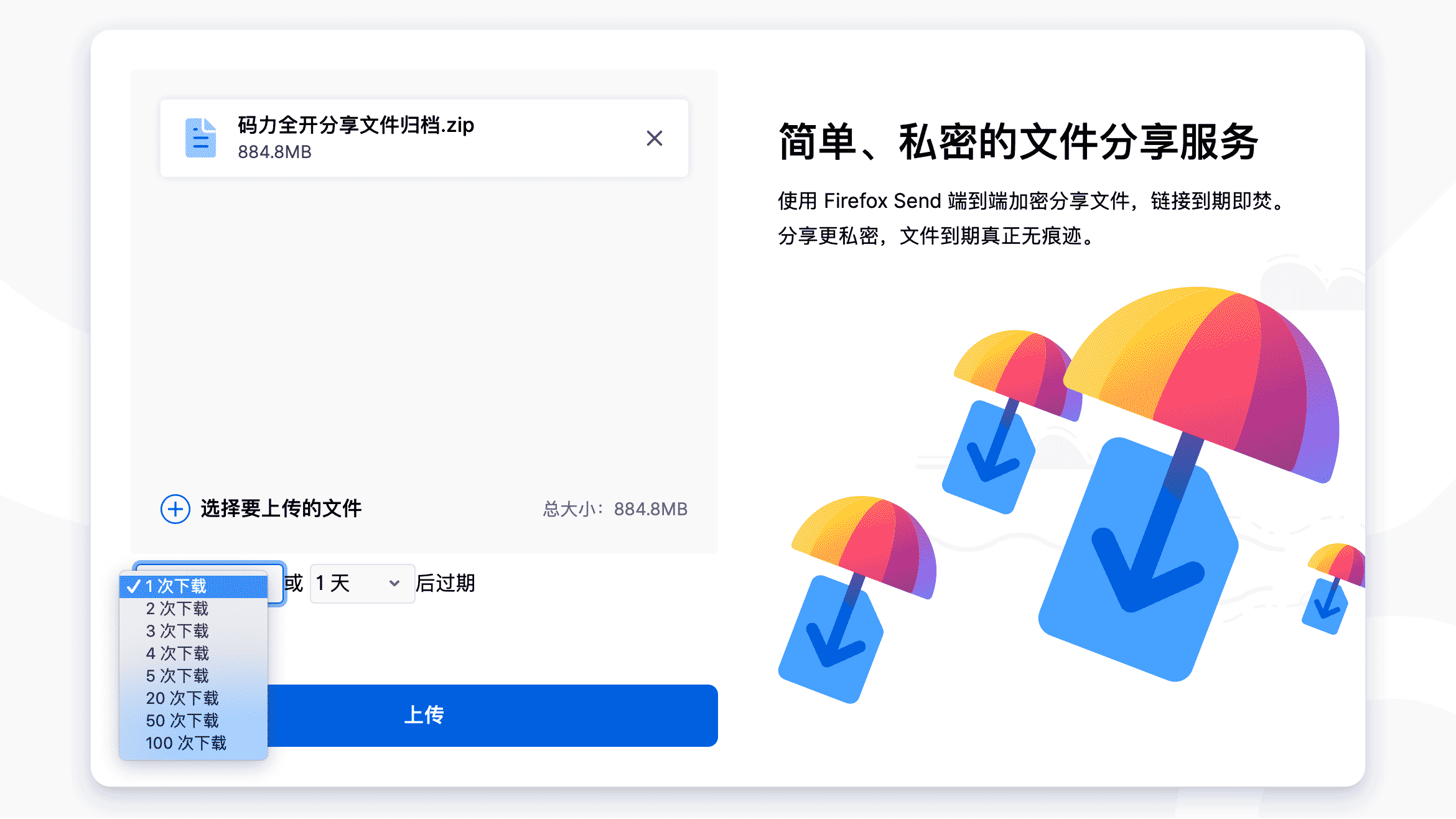 Firefox Send默认支持分享最大1GB的文件、1次下载、1天后分享链接过期,登录Firefox账户后,可以传送最大2.5GB文件、100次下载、 7天后分享链接过期。