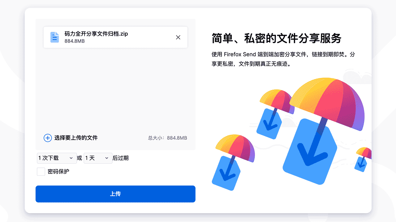在上传文件之前,你还可以手动勾选密码保护,并在本地手动设置下载密码保护增强文档安全。当然,无论你有没有设置密码保护,Firefox Send都会自动加密你的文档进行保护的。
