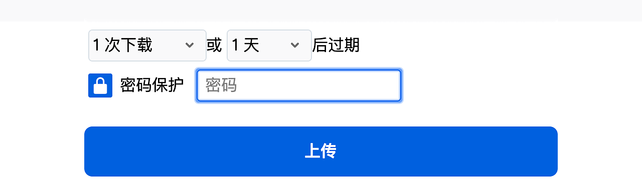 之后你可以根据需要设置下载次数及文件过期时间,非登录用户上传文件仅支持1次下载,5分钟、1小时、1天保存时间,登录用户支持1次、2次、3次、4次、5次、20次、50次、100次下载,5分钟、1小时、1天、7天保存时间,分享链接会在文件保存时间到期后删除。