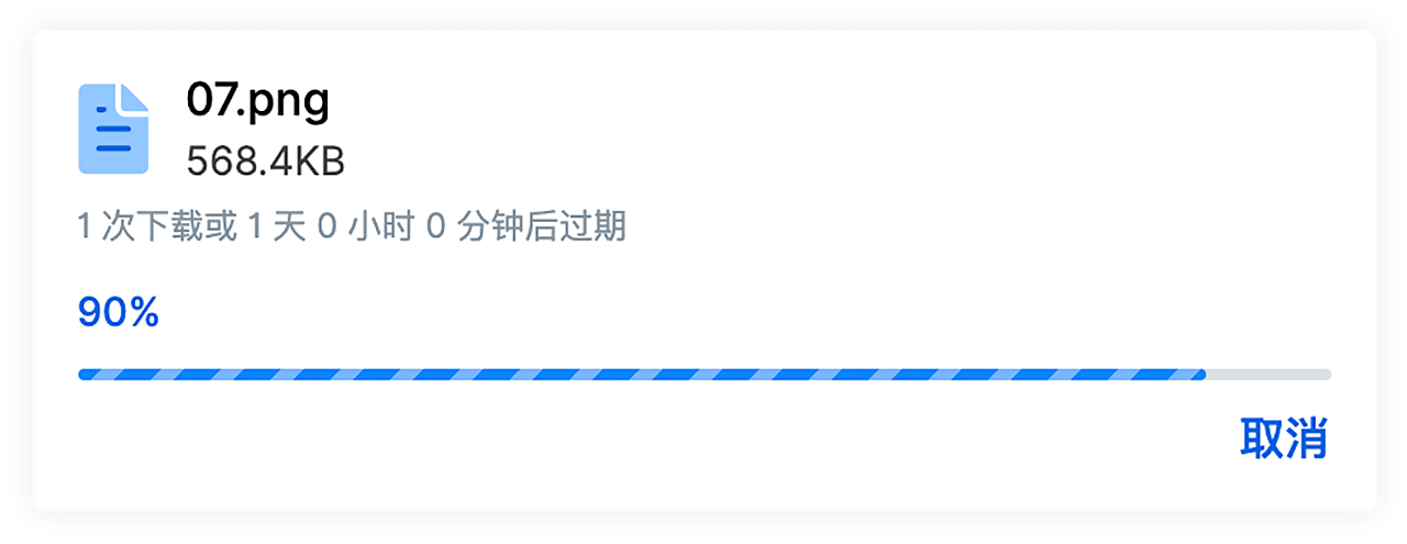 文件上传过程会显示文档名称、文档大小、设定的下载次数、过期时长、上传进度,当然你也可以点击「取消」终止对该文档的上传及分享。