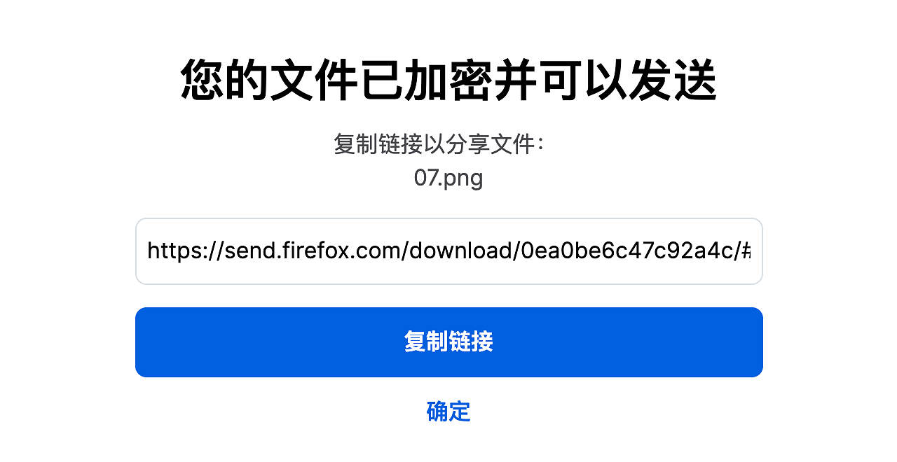 上传成功的文件Firefox Send会显示文件已加密,你可以直接复制文件链接,也可以点击「复制链接」按钮一键复制链接。
