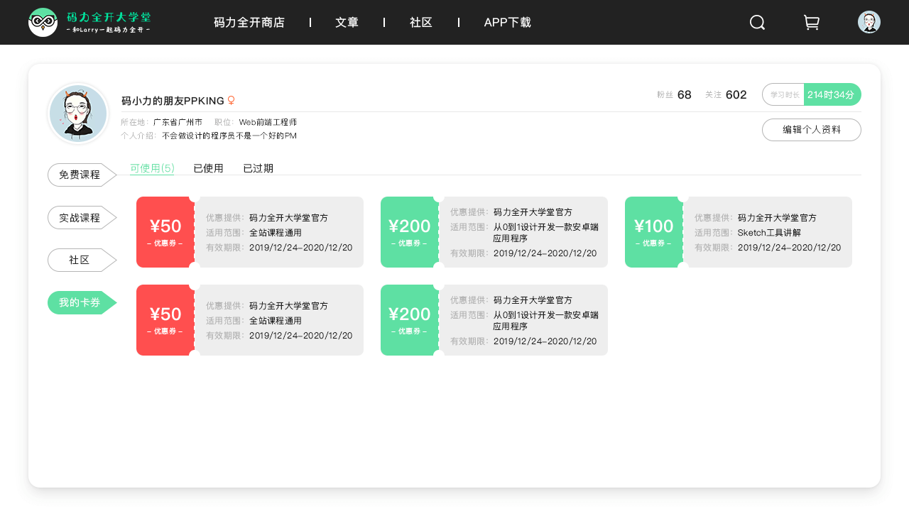 - 7.20号之前注册登录码力全开大学堂的用户现在个人中心都会收到一张价值50元的全站通用优惠券。